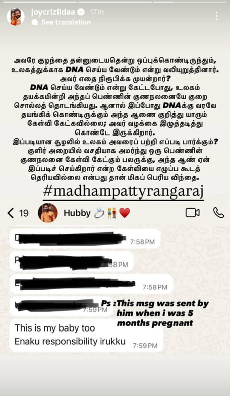 இந்த நிலையில், ஜாய் கிரிஸில்டா தனது இன்ஸ்டா பக்கத்தில் மாதம்பட்டி ரங்கராஜ் தனக்கு அனுப்பிய மெசேஜை பகிர்ந்துள்ளார். அதில் தான் ஐந்து மாத கர்ப்பமாக இருக்கும் போது மாதம்பட்டி ரங்கராஜ் இது என்னுடைய குழந்தை, அதற்கான பொறுப்பை நான் ஏற்பேன் என்று அவர் அனுப்பிய மெசேஜை பப்ளிக் ஆகியுள்ளார்.